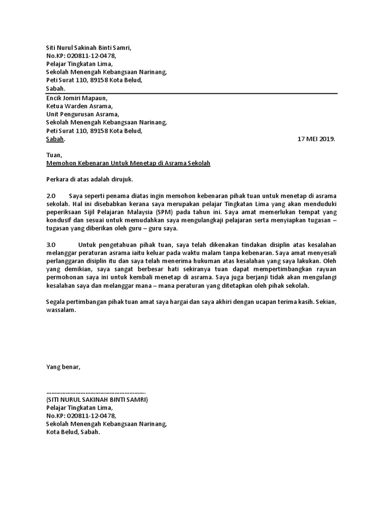 Contoh Surat Permohonan Keluar Dari Asrama Otosection